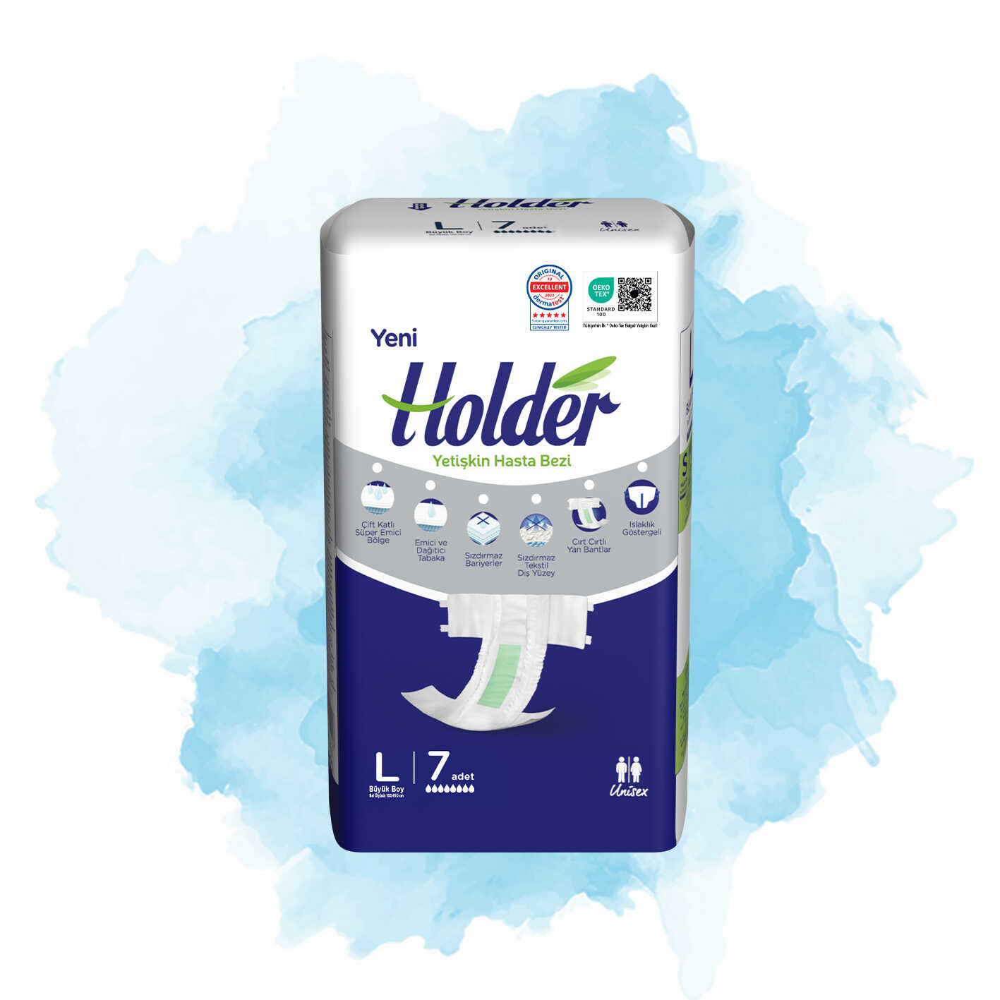 Holder Yetişkin Hasta Bezi, çift katlı süper emici bölgesi ile idrar kaçırma sorunu yaşayanların kendilerini güvende ve kuru hissetmelerini sağlar. Alman Dermatest Laboratuvarları’nda yapılan klinik testler sonucu en üst seviye olarak belirlenen ‘5 Star Premium Segment’ (5 yıldızlı üstün segment) derecesiyle kullanıcıların cildini özenle koruduğu kanıtlanmıştır.