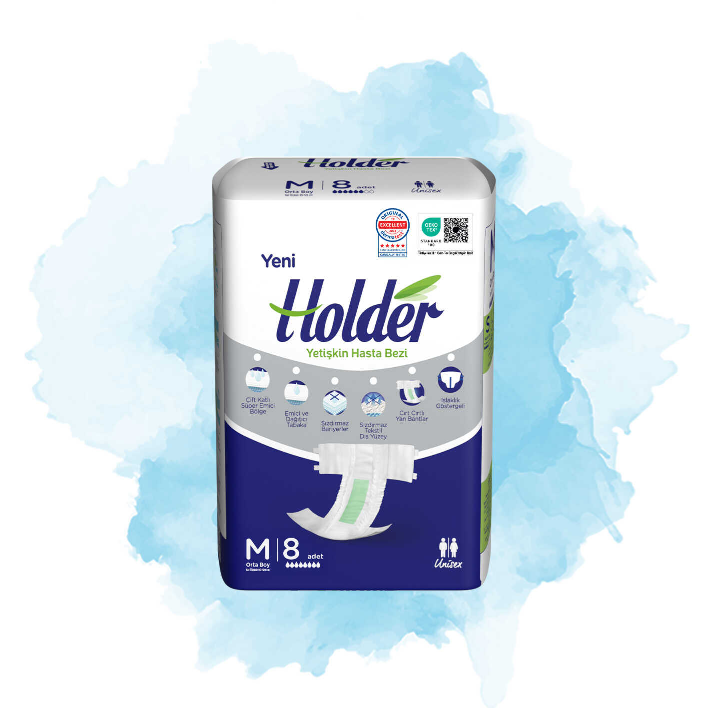 Holder Yetişkin Hasta Bezi, çift katlı süper emici bölgesi ile idrar kaçırma sorunu yaşayanların kendilerini güvende ve kuru hissetmelerini sağlar. Alman Dermatest Laboratuvarları’nda yapılan klinik testler sonucu en üst seviye olarak belirlenen ‘5 Star Premium Segment’ (5 yıldızlı üstün segment) derecesiyle kullanıcıların cildini özenle koruduğu kanıtlanmıştır.